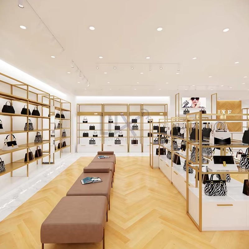 Product Name: Bags Shop Design Type: Customized Design: Free 3D+CAD Design Material: Wood/Glass/Metal/Acrylic Warranty: 5 years Service: OEM ODM Support